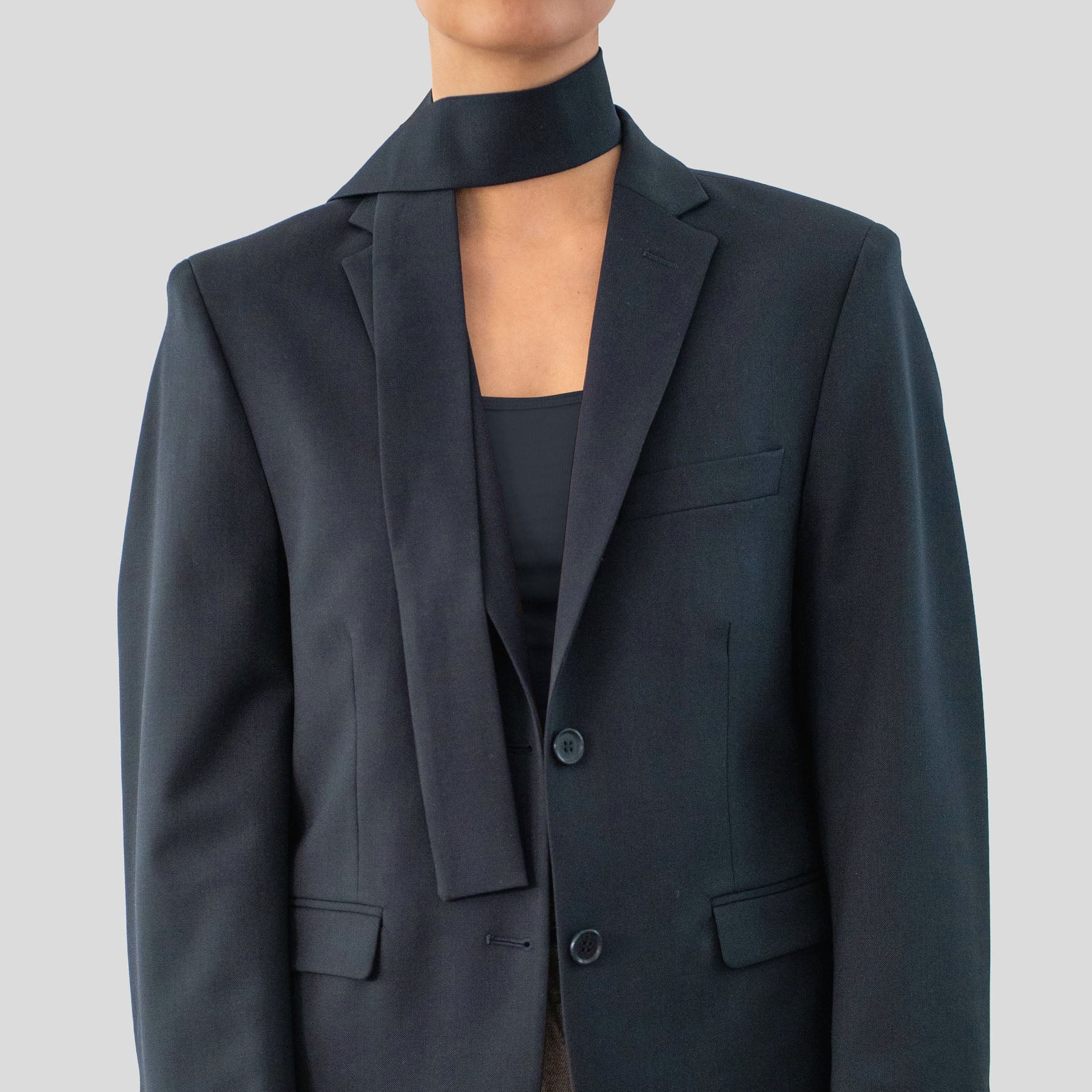 Oversized boyfriend blazer met bijpassend sjaaltje in een duurzame wolblend met viscosevoering. Voorzien van klassieke revers, klepzakken, borstzak, sluiting met twee knopen en enkelvoudige rugsplit.